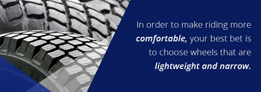 In order to make riding more comfortable, your best bet is to choose wheels that are lightweight and narrow. Ideally, tire measurements should not exceed 18" in diameter and 7" in width.