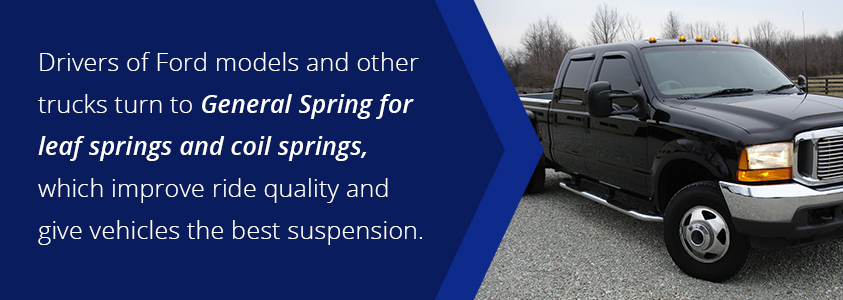If you are wondering how to make your truck ride smooth, the most probable answer is a new or improved set of leaf springs. Drivers of Ford models and other trucks turn to General Spring for leaf springs and coil springs, which improve ride quality and give vehicles the best suspension for smooth rides on all different types of terrain.
